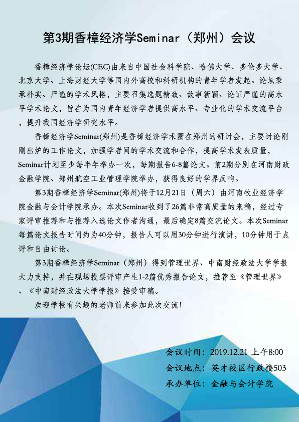 第3期香樟经济学Seminar(郑州)会议海报