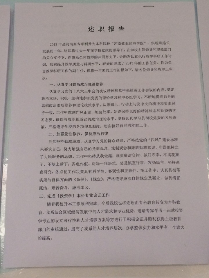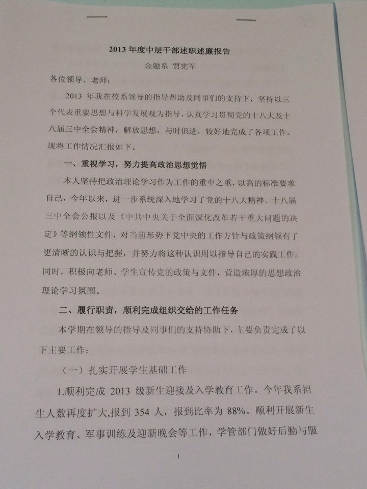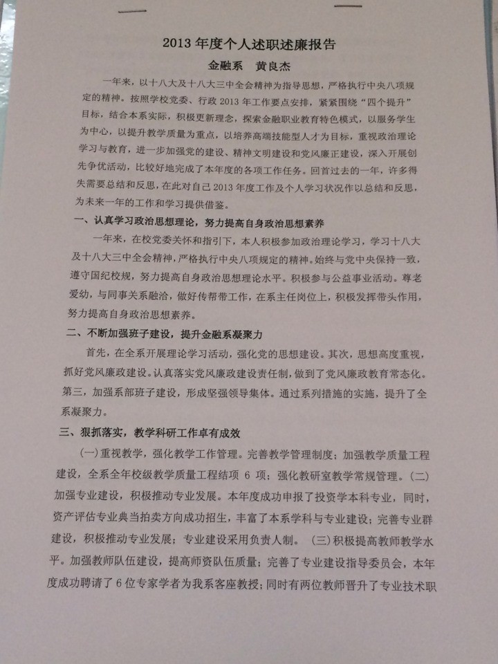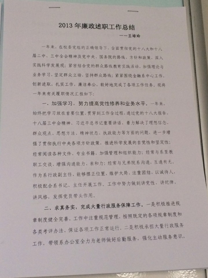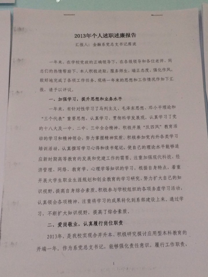 金融系2013年度述廉述职报告及考核公示