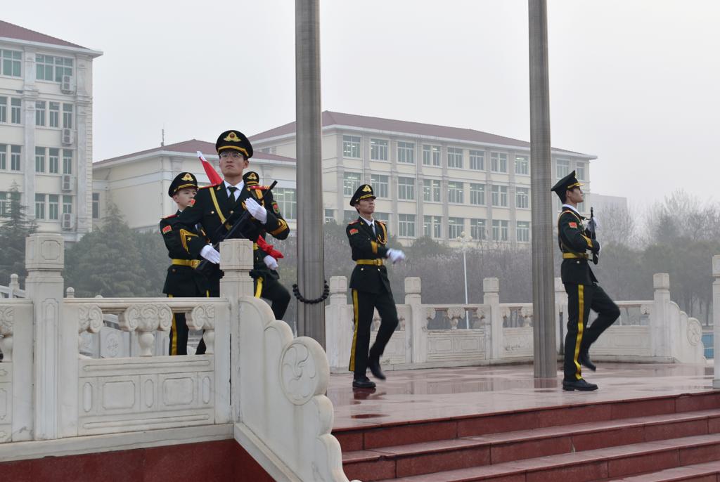 升旗仪式在国旗护卫队铿锵的脚步声中开始,伴随着激昂的国歌声,鲜艳的五星红旗冉冉升起,迎着朝阳和春风高高飘扬,全体师生庄严肃立,共唱国歌。