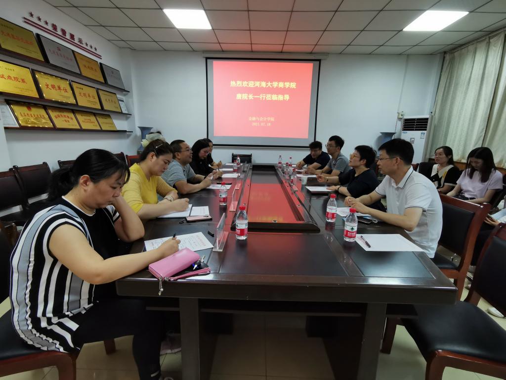 7月18日下午,河海大学商学院院长唐震、教师胡兴球等一行来williamhill英国中文调研交流,院长黄良杰、副院长邵翠丽、金融学教研室主任宋晓薇等参加座谈会。
