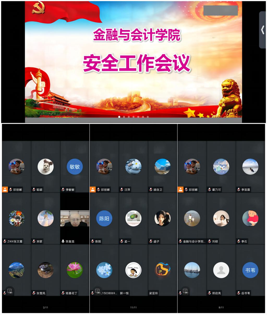 会上,陈书记首先传达了学校校园安全工作会议精神,他强调我们务必要牢记各种安全事项,绷紧安全这根弦,切实增强安全意识,全面提升安全素养,切实提高面临突发安全事件自救、自护、处置能力,牢固树立“安全第一”的观念,全面落实安全责任。最后,陈书记提出几点要求,一是要牢固树立国家整体安全观,全面理解和把握大安全理念,为筑牢国家安全防线、共建和谐幸福家园作贡献。二是要牢记“安全第一,预防为主”,严格做好消防(含用电用气用火)、溺水、食品(含酗酒)、交通、传染性疾病、盗窃诈骗、自然灾害等各项安全隐患防范,离开办公和生活场所前全面做好安全隐患排查排除,确保人身安全、财产安全。牢固树立自己是自身安全第一责任人理念,落实好各项安全措施,防范和化解各项安全风险。三是要做到“安全无小事、责任大于天”,坚持“人民至上、生命至上”。各分管领导分工负责落实安全责任,确保不出现任何安全责任事故,辅导员老师务必把安全教育、安全提醒工作向全体学生做到位,教育、提醒到每一位学生做好预防和应对自然灾害、事故灾难、公共卫生、社会安全等事故事件,高度关注学生人身安全、财产安全,高度关注学生身心健康。