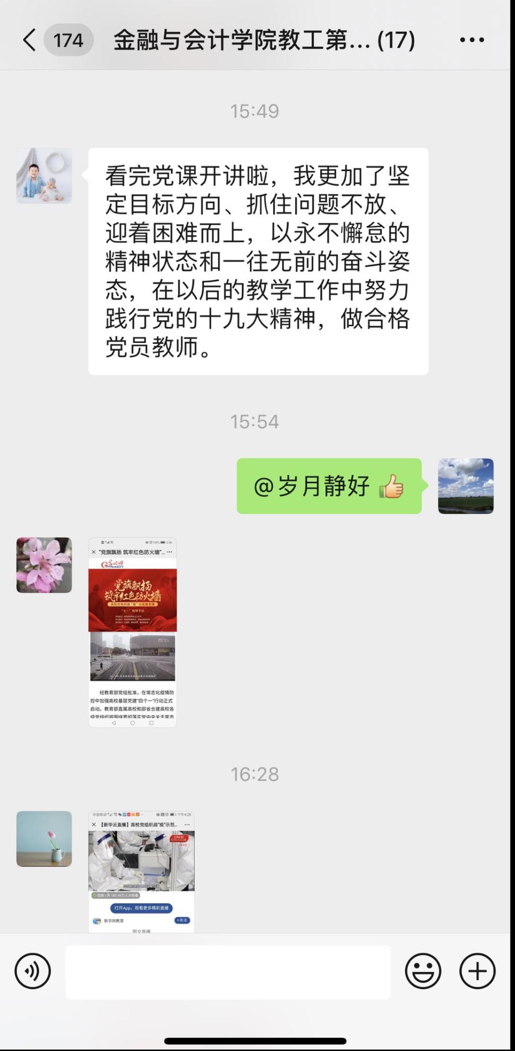 观看结束,全体党员在微信群积极发言,把自己在抗疫期间的感受和看到的先进事迹互相交流学习,索静老师表示看完战“疫”示范微课后,自己更加坚定了目标方向,抓住问题不放、迎着困难而上,以永不懈怠的精神状态和一往无前的奋斗姿态,在以后的教学工作中努力践行党的伟大精神,做合格党员教师。其他教师也纷纷表示要向先进学习,充分发挥党员先锋模范作用,在日常工作和生活中做好本职工作。