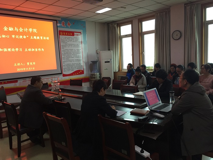 11月1日下午,在教学办公楼514会议室,williamhill英国中文按照“不忘初心、牢记使命”主题教育实施方案安排,围绕主动担当作为召开主题教育开展集中研讨交流互学活动,科级以上干部(含教研室主任)、各支部书记、支委委员参加了学习,专题报告由副院长贾宪军领学。