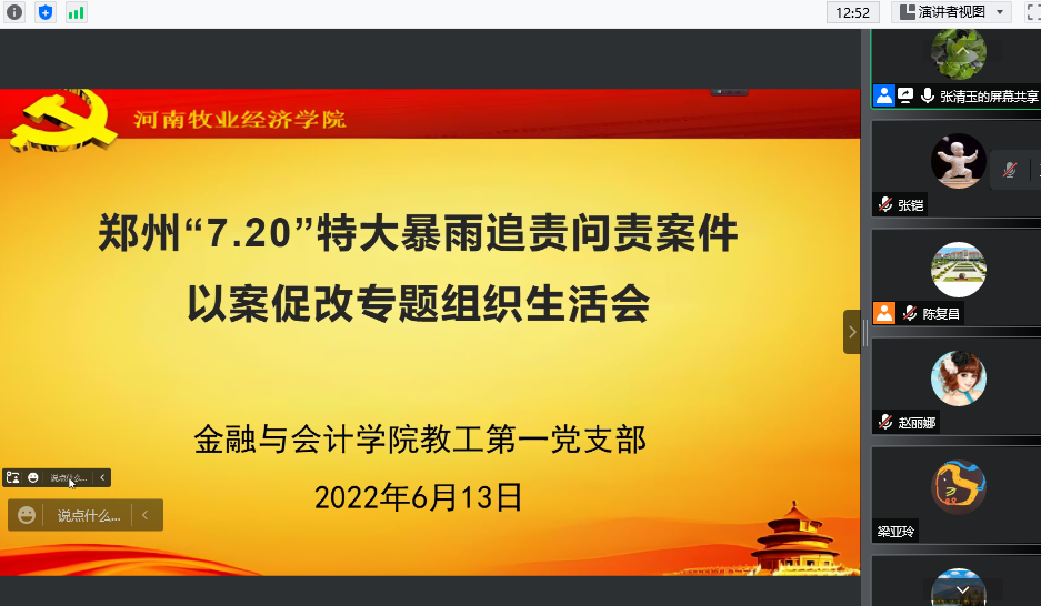 2022年6月13日上午,williamhill英国中文教工第一党支部召开“7·20”特大暴雨灾害追责问责案件以案促改专题组织生活会。学院党委书记陈复昌、党委副书记汪晓伟及第一党支部全体教工党员参加会议,会议由党支部书记张清玉老师主持,通过腾讯会议的形式进行。