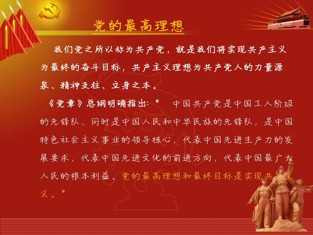 刘老师从共产党的性质讲起,详细地从“两个先锋队”、“一个领导核心”和“三个代表”等方面内容进行分析讲解,强调了中国共产党以马克思列宁主义、毛泽东思想、邓小平理论、“三个代表”重要思想、科学发展观和习近平新时代中国特色社会主义思想作为自己的行动指南。中国共产党领导是中国特色社会主义最本质的特征。接着,刘老师讲述了党的最高理想和最终目标是实现共产主义,共产主义理想是共产党人的力量源泉、精神支柱和立身之本。她强调,实现共产主义作为共产党人的崇高理想和最高目标,不会一蹴而就,只有在社会主义社会充分发展和高度发达的基础上才能实现,需要经历相当长的历史发展过程。这就要求共产党员无论在什么时候什么情况下,无论遇到什么困难和风险,心中都要有理想的明灯,坚定共产主义必胜的信念。