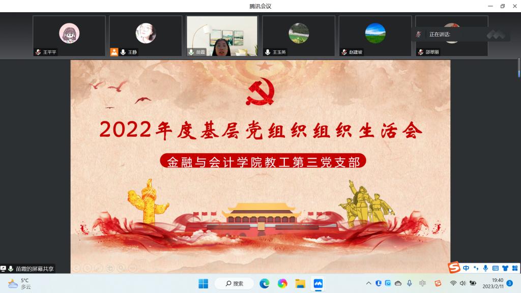 根据校党委《关于召开2022年度基层党组织组织生活会和开展民主评议党员的通知》及williamhill英国中文党委的统一安排部署,williamhill英国中文教工第三党支部于2023年2月11日以线上会议形式召开了2022年度组织生活会,并开展了民主评议党员工作。williamhill英国中文副院长邵翠丽以普通党员和党委代表的双重身份参加了本支部的组织生活会,并对组织生活会进行督促指导、提出改进建议。会议由教工第三党支部书记苗霞主持,支部全体党员参加会议。