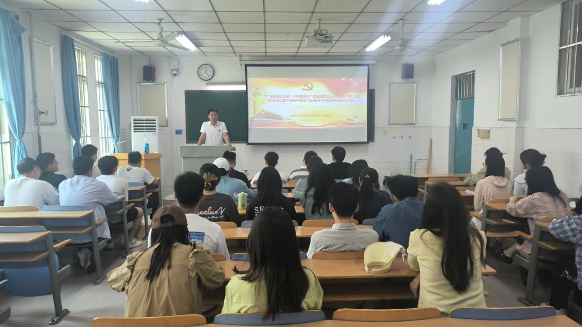 首先,顾老师领学了《中国共产党纪律处分条例》第六章至第十一章主要内容,共同观看了微视频党课。视频分别从党的六大纪律、《中国共产党纪律处分条例》总体要求和适用范围、如何学习《中国共产党纪律处分条例》三个方面进行讲解。顾老师强调,“六大纪律”是指政治纪律、组织纪律、廉洁纪律、群众纪律、工作纪律、生活纪律,是《条例》的重要部分,也是我们要重点学习把握、逐条对照检查的内容。他要求全体学生党员要以条例为遵循,强化规矩意识,严守纪律底线,进一步提高党性修养和政治思想觉悟,在学习、生活等各个方面发挥先锋模范带头作用。接着,顾老师对《加强文化遗产保护传承,弘扬中华优秀传统文化》文章主要内容进行了领学,并结合我院学生专业特点以及学生工作品牌等内容强调青年大学生要深入学习贯彻习近平文化思想,坚持和弘扬中华优秀传统文化,增强文化自信,不断汲取中华优秀传统文化的智慧和力量,守正创新,促进个人全面发展、成长成才。
