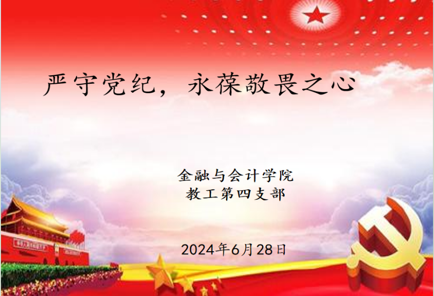 为进一步提升党纪学习教育成效,加强党员的纪律意识和自我约束能力,2024年6月28日上午,williamhill英国中文教工第四党支部书记王豪杰以《严守党纪,永葆敬畏之心》为题,为支部党员讲授了党纪学习教育专题党课,支部全体党员参加了学习与研讨。