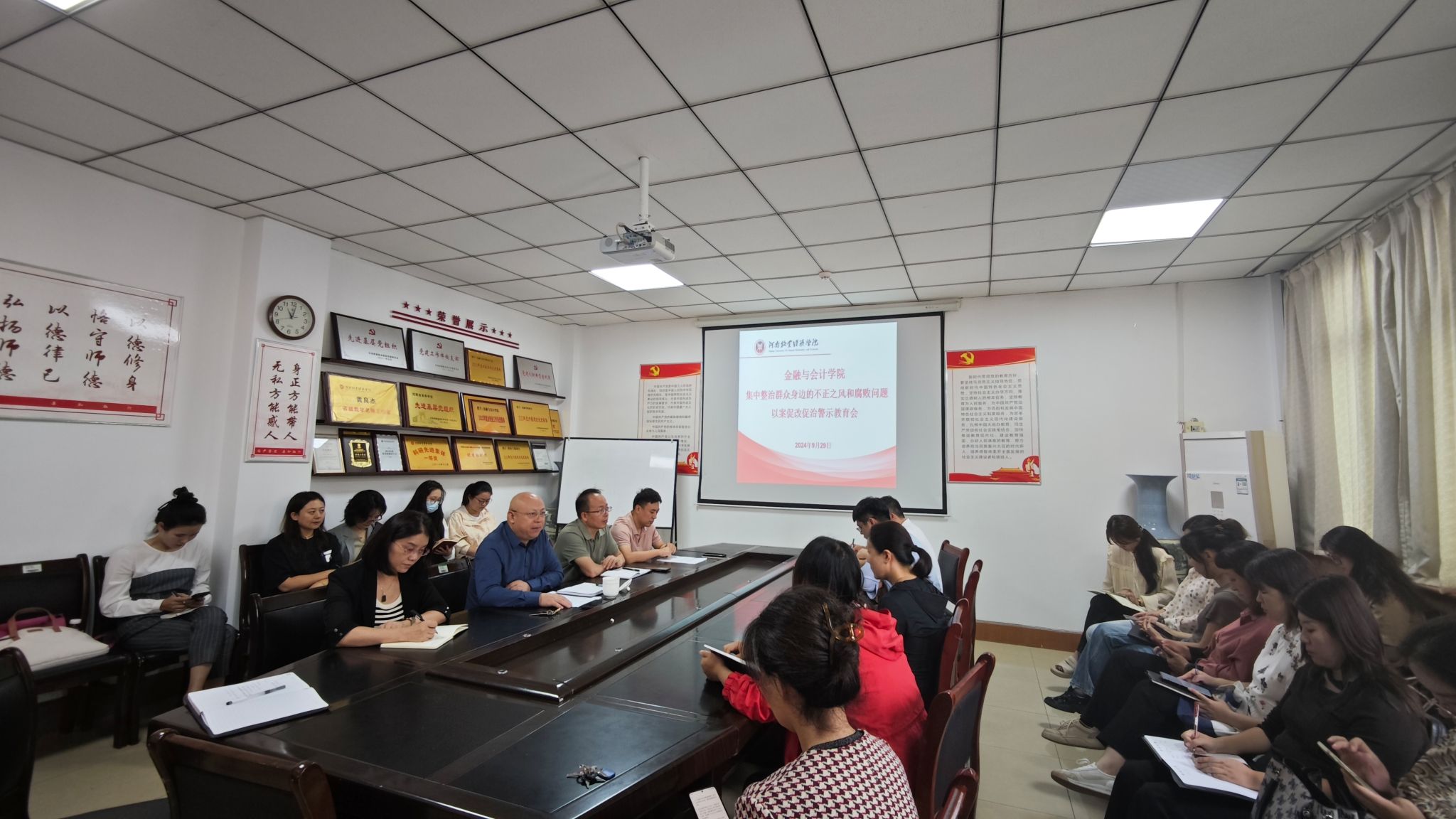 随后,在与参会人员进行集体谈话中,陈书记提出了几点要求,一是要持续深学细悟习近平总书记关于党的自我革命的重要思想和以人民为中心的发展思想,切实提高政治站位和思想认识,进一步增强全面推进集中整治的责任感紧迫感。二是学院党委和各党支部切实扛牢主体责任,加强党的统一领导,党政齐抓共管,认真履行“一岗双责”,严于律己、严负其责、严管所辖,始终坚持严的标准、硬的措施、实的作风,坚定不移推动反腐败斗争向基层延伸、向群众身边延伸,纵深推进集中整治,加强排查、日常监督管理,树牢为民宗旨,切实增强群众获得感,厚植党执政的政治基础和群众基础。三是要以案为戒,深刻反思,认真开展自查自纠,不断增强自我净化、自我完善、自我革新、自我提高能力。四是要讲纪律、守规矩、有底线、存戒惧,牢固树立法制意识、纪律意识、规矩意识,不越纪律红线,不触法律底线,不断增强拒腐防变能力。五是要牢固树立正确的权力观、地位观、利益观,弘扬忠诚老实、光明坦荡、公道正派、实事求是、艰苦奋斗、清正廉洁等党内政治文化,做到权为民所用、情为民所系、利为民所谋。六是要坚持以人民为中心的发展思想,坚持人民至上理念,践行为民宗旨,坚持群众路线,始终把师生群众利益放在首位,以师生群众满意为标准,不断改进工作作风,提高服务质量和效率用实际工作造就新征程上师生群众满意新高度。七是要涵养高尚师德,模范遵守新时代教师职业行为准则,大力弘扬教育家精神,牢记立德树人根本任务,坚守道德高地。