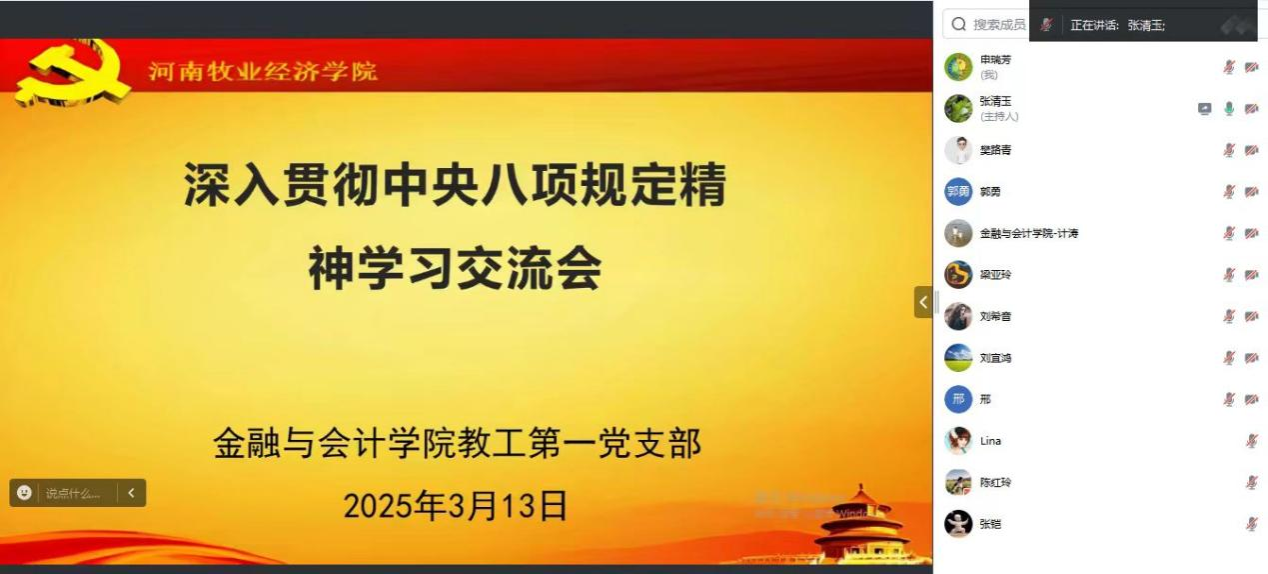 2025年4月29日,按照学校党委统一安排,williamhill英国中文教工第一党支部召开深入贯彻中央八项规定精神学习教育交流会。会议采用线上形式,由教工第一党支部书记张清玉同志主持,教工第一党支部全体党员参与学习交流。