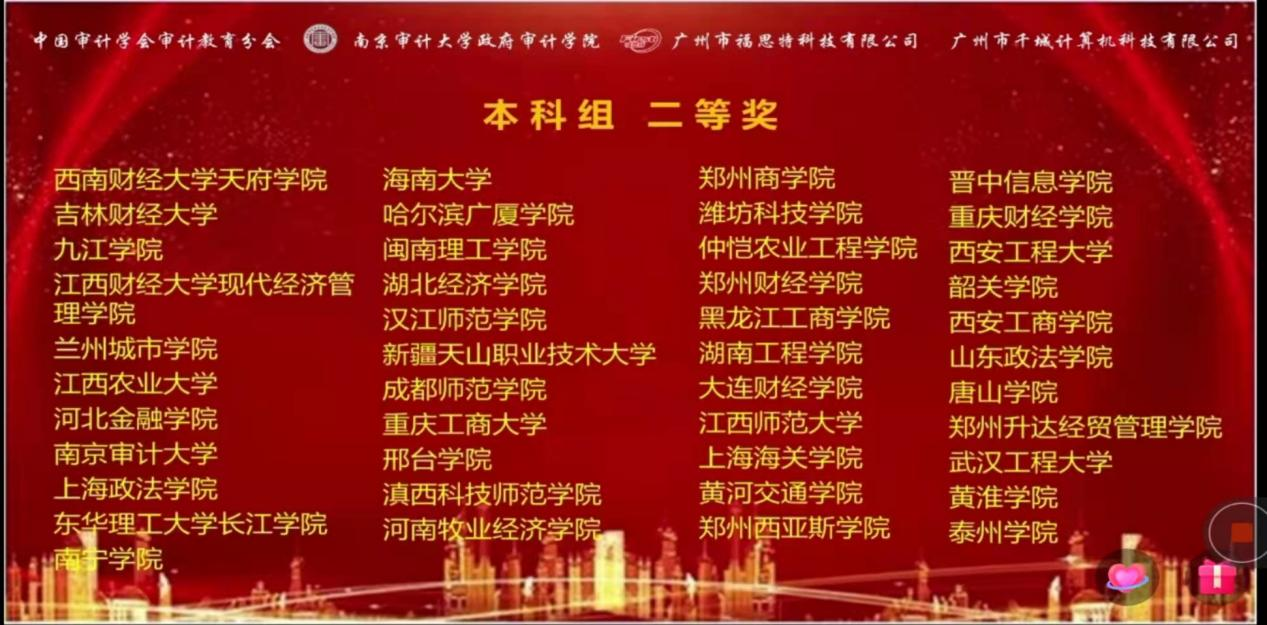 我院18注会一班王煖煖、18注会三班郝艳毅、18注会三班苗益在审计学教研室崔海红、霍乃可两位老师的指导下首次参加比赛。经过激烈角逐本科组全国215支队伍中,我院以全国排名第44、河南省参赛高校排名第一的成绩荣获大赛团队“二等奖”的佳绩,崔海红、霍乃可两位老师获得“优秀指导教师”荣誉称号