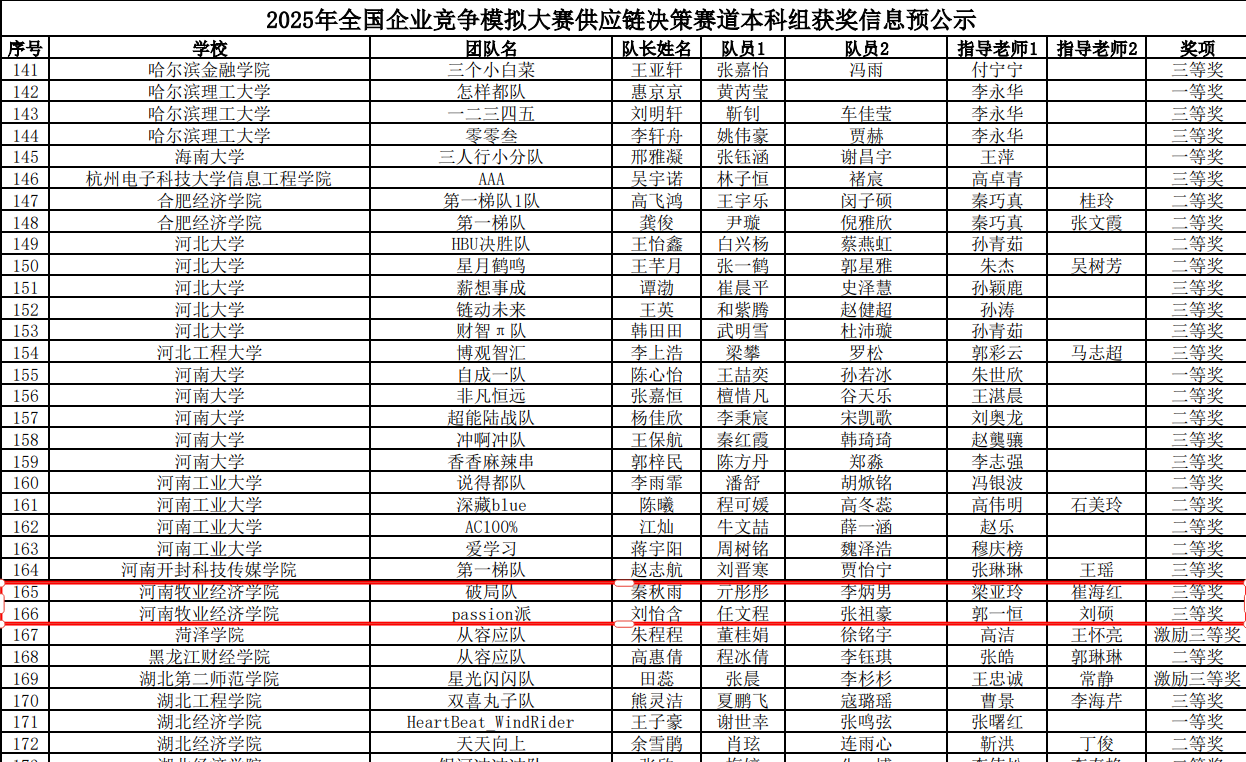 在院领导的支持下,我院组织学生积极备赛,最终在“数智沙盘赛道”和“供应链决策赛道”中斩获全国二等奖(三个)和三等奖(两个),此赛道是我校学生第一次参加。此次学生的优秀表现是我院高度重视双创教育和实践育人的成果体现,学院将继续秉承“以赛促学、以赛促教”的育人理念,加强学生创新能力和实践能力的培养,助力学生全面发展。