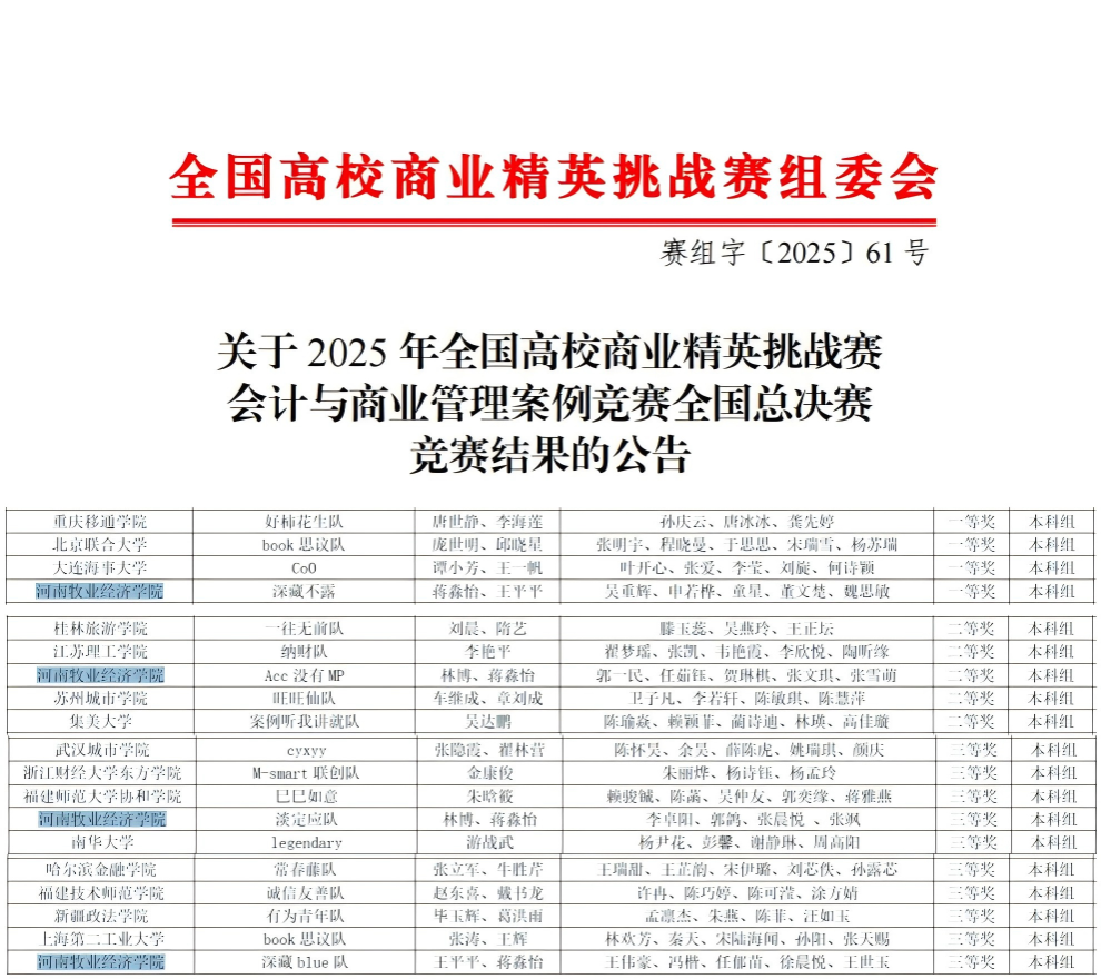 近日,2025年全国高校商业精英挑战赛会计与商业管理案例竞赛全国总决赛落下帷幕,经过激烈角逐,我院学子共斩获国家级一等奖1项,二等奖1项,三等奖2项。