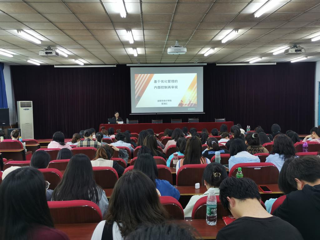 讲座正式开始前,崔海红博士做了审计专业介绍,从如何规划大学生活、就业方向和就业目标这三个方面给学生们以启迪。接着,崔海红博士从”为什么建立内部控制、什么是内部控制和内部控制建设的基本思路”等三个方面进行展开,她详细讲解了内部控制的内容以及内部控制与风险管理发展历程,介绍了内部控制的目标和实现手段。她指出,制度体系建设推进内部控制,现代信息技术手段支撑内部控制,财务人能力提升内部控制。内部控制最初产生于一个会计问题,现在是个管理问题,内部控制任重而道远。崔博士列举了关键岗位人员、管理人员信念缺失,行为失范,漠视纪律,突破法律底线,走上违法犯罪道路的典型犯罪案件,结合讲座的主题给大家进行剖析和解读。崔博士用鲜活的案例、详实的数据、深入浅出的分析,赢得全体参会人员阵阵掌声和一致好评。