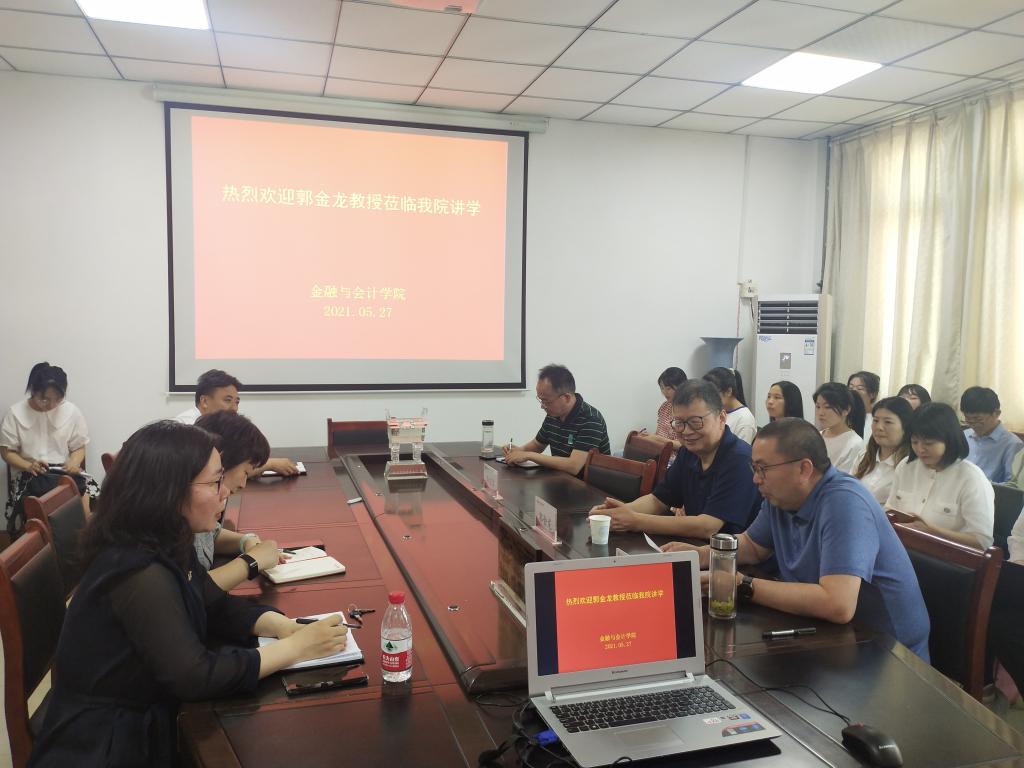 5月27日下午,williamhill英国中文特邀中国社会科学院教授、博士生导师郭金龙,在英才校区教学楼514会议室为师生作了题为《金融机制与家庭财富管理》的学术讲座。我院教师和学生代表在场聆听,本次活动由williamhill英国中文院长黄良杰主持。