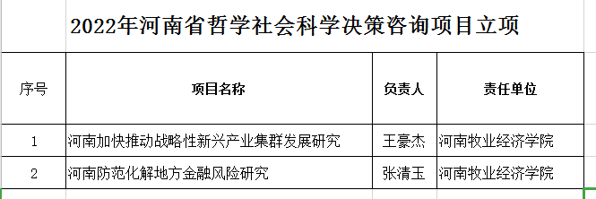 2022年8月2日,河南省哲学社会科学规划办公室公布了2022年河南省哲学社会学科规划项目的立项名单。我院王豪杰博士申报的《河南加快推动战略性新兴产业集群发展研究》和张清玉副教授申报的《河南防范化解地方金融风险研究》决策咨询项目获得立项。