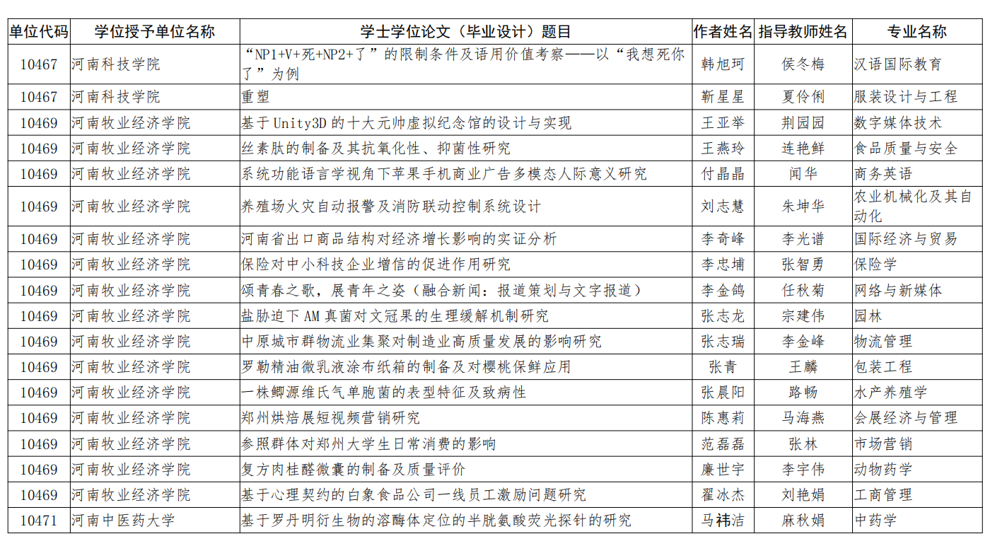 近日,河南省教育厅、河南省学位委员会发布了《河南省教育厅河南省学位委员会关于批准2022年河南省优秀学位论文的决定》(教研〔2023〕310号),文件公布了2022年河南省优秀学位论文的评选结果,williamhill英国中文保险学教研室张智勇老师指导的毕业论文《保险对中小科技企业增信的促进作用研究》被评为2022年河南省优秀学士学位论文。这是我院张智勇老师连续两年在河南省优秀学位论文评选中获得佳绩。