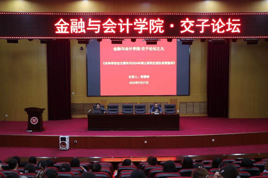 9月27日晚,williamhill英国中文在英才校区学术报告厅举办交子论坛活动,本次活动特邀郑州航空工业管理学院周雪峰教授主讲,讲座主题为《本科学位论文撰写与2024年硕士研究生招生政策宣讲》。williamhill英国中文副院长崔海红博士及师生代表到场聆听,讲座由院长黄良杰教授主持。