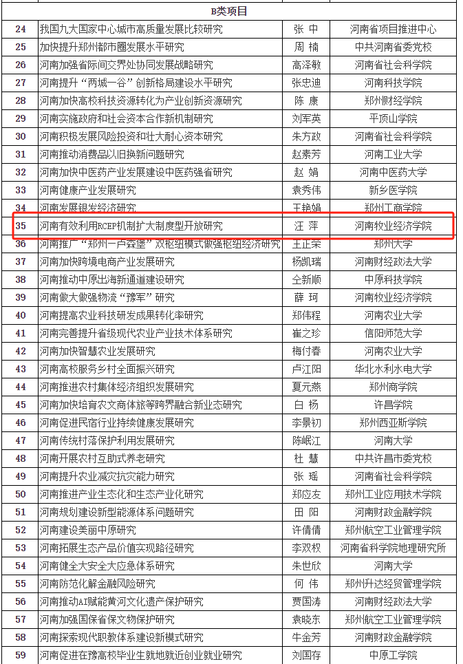 近日,2024年度河南省政府决策研究招标课题立项名单公示,我院汪萍博士申报的《河南有效利用RCEP机制扩大制度型开放研究》课题获批立项资助。