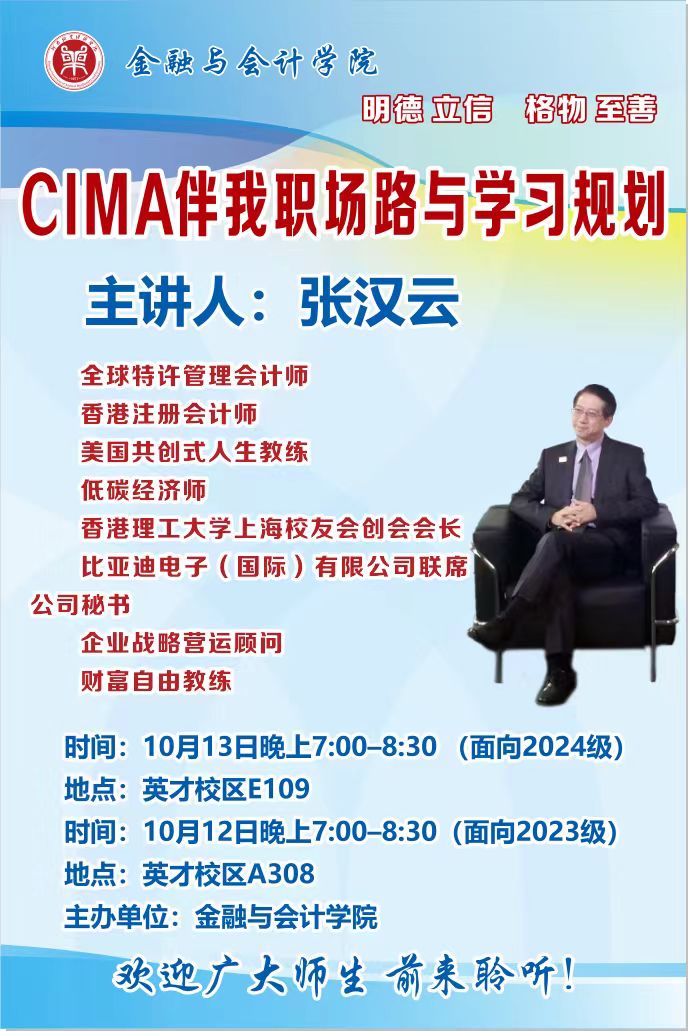 2024年10月12日,williamhill英国中文邀请全国特许管理会计师,比亚迪电子(国际)有限公司联合公司秘书张汉云先生举行了“CIMA伴我职场路与学习规划”的讲座,此次讲座吸引了CIMA方向班在校大学生,旨在帮助学生们更好地了解管理会计领域的最新发展及职业规划。