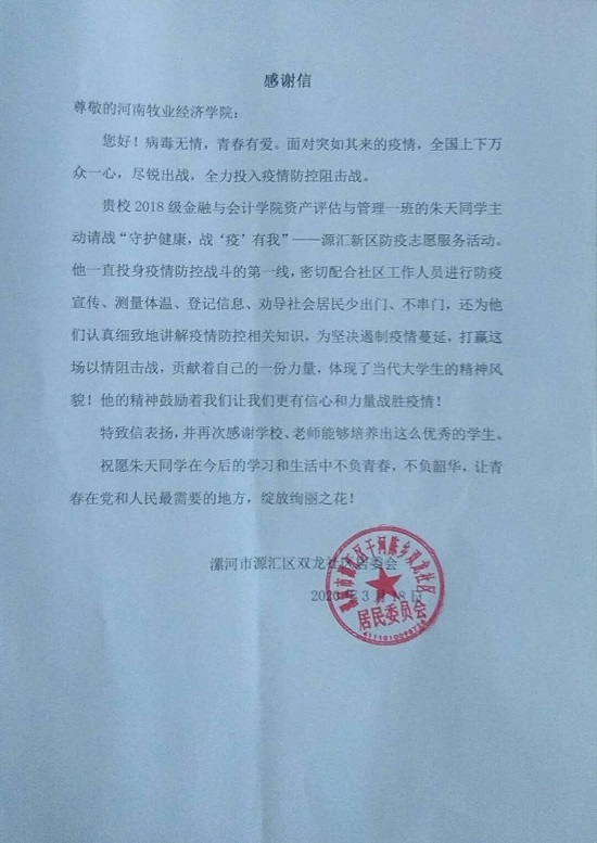 河南省漯河市源汇区双龙社区居委会发来感谢信,对我校williamhill英国中文2018级资产评估与管理一班的朱天同学在家乡疫情防控工作中的表现予以表彰和感谢。