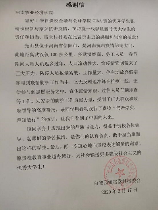 河南省信阳市光山县白雀园镇雷堂村委会特发来感谢信,对我校williamhill英国中文2018级CIMA班的张靖同学在家乡疫情防控工作中的突出贡献予以表彰和感谢。