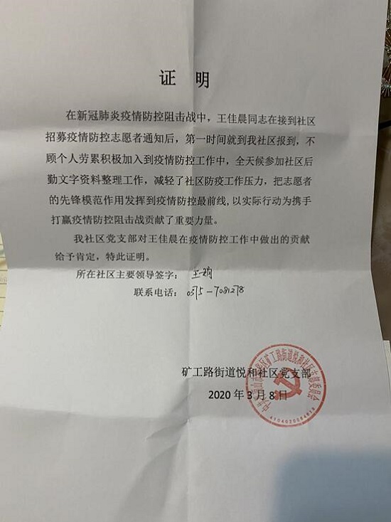 王佳晨同学是班级的文艺委员,具有积极的上进心,平时就主动参与志愿活动,努力为社会奉献自己的力量。王佳晨同学是众多青年社区志愿者的一员,作为一名加入中国共青团的在校大学生,正是向党和人民证明自己有能力有决心加入中国共产党的年纪。她积极响应单位号召,在做好个人安全防护的前提下,迅速组织志愿者队伍并一同投入到疫情防控战斗中。虽然没有能力去到最前线,但积她极完成善后工作,整理资料,完善信息,整理了一本又一本文件、表格,为更好的管理社区居民提供里帮助。