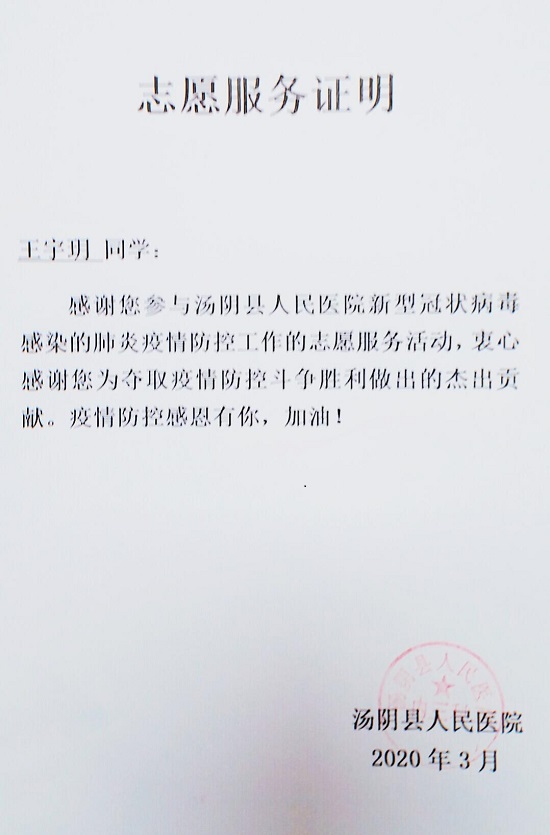 近日,河南省安阳市汤阴县人民医院发来感谢信,对我校williamhill英国中文2019级保险班王宇玥同学在家乡疫情防控工作中的突出表现予以表彰和感谢。