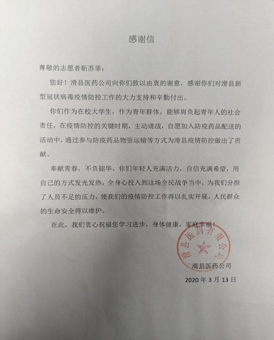 本次疫情期间,我院学生靳苏菲很荣幸自己能够作为志愿者为本次疫情贡献自己的一份力量。此次疫情的志愿工作主要是参与防疫药品物资运输与配送,这次活动,让她了解到志愿服务活动培养她的不仅仅是一种精神,更是培养了自己的极限和耐力,同时也看到自己的潜力。每当感到疲惫的时候,想想战疫前线的白衣战士,想想值岗值班的公安卫士,想想临危不惧的社区勇士,想想身边和她并肩作战的志愿者们,期待如李贺曾在诗中所道“寒风又变为春柳,条条看即烟濛濛”,期待冬天快点过去,期待春天快点到来,期待疫情早日散去,祖国无恙,你我皆安,人间充满爱与希望,想到这里也就不会感到那么累了。