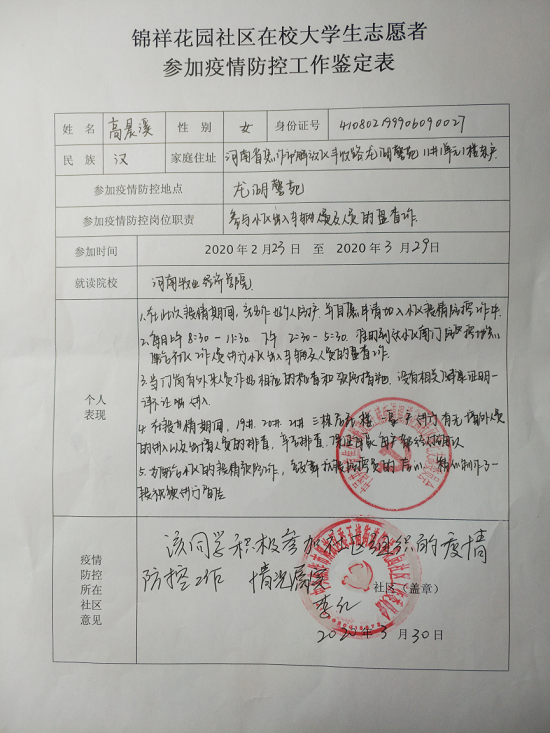 “之所以盛世太平,不过是有人在前负重前行”,在抗击疫情的前线,无数白衣战士英勇奋战,协力攻坚。作为一名受过党和学校教育过的大学生,我院17级CIMA 班的学生高晨溪在疫情暴发的一开始就应义无反顾地报名参加当地社区的志愿者招募,为社会贡献出属于自己的一份担当。她每日佩戴着标有志愿者的红色袖章,在小区入口对进出小区的车辆、人员进行体温测定并登记,对外来车辆合理地进行劝退。同时还通过用视频在小区业主群里转发,并宣传疫情防控的有关知识,鼓励家人进行物资捐款,以实际行动为社区防疫工作助力,她也深切地体会到了政府与社区抗击疫情的艰辛。同时,在真切地看到政府以及群众为疫情防控所付出的心血和采取的措施之后,她坚信一定会在政府的正确领导下以最快的速度战胜疫情,结束战斗。