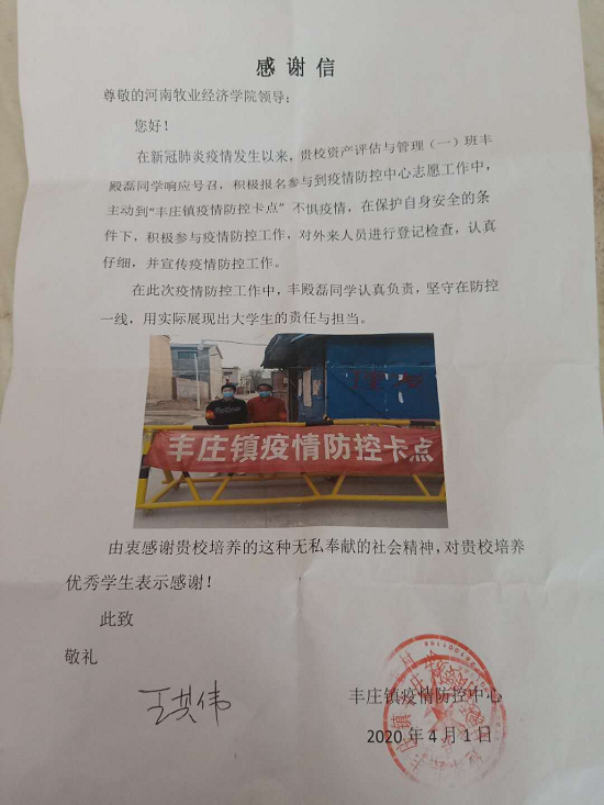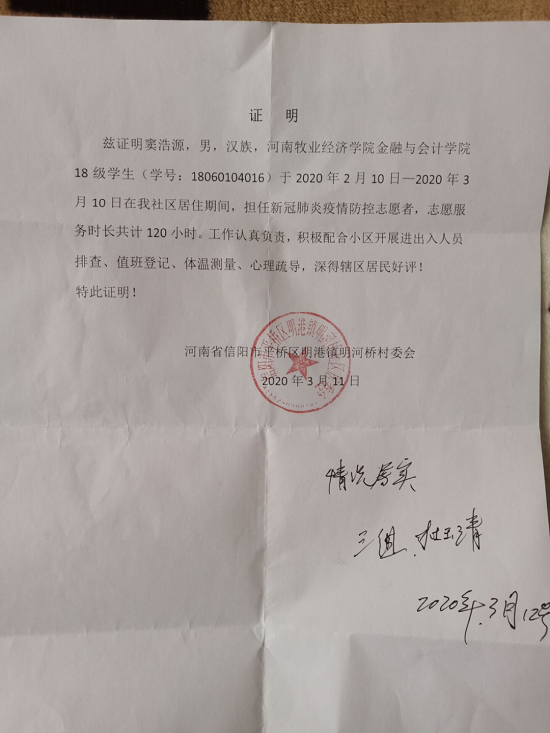 我院18级投资四班学生窦源浩非常荣幸的成为了一名村民志愿者,为村里进行疫情防控工作贡献出自己的一份力量。起初他只是单纯的想要做这件事,但到后来,他才明白他这个决定是多么正确,因为身为当代大学生,他们应该在国家有难之时挺身而出,为国家奉献出自己的一份绵薄之力。作为共青团员的他,应该尽好自己身为团员的责任,积极为村里疫情防控工作奉献自己的力量。在这段志愿者工作期间,虽然很辛苦,但是他从中学到了很多,责任之大重于泰山,因此他必须严格检查进行防护,对进出人员进行排查、值班登记以及体温测量,避免任何一个可能携带或患有新型冠状肺炎的人进入村子,这样才能保障村民的人身安全。