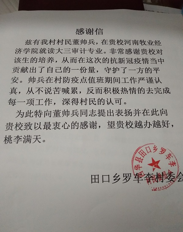 我院学生董帅兵,他对新冠疫情的记忆是从除夕的春晚开始的,再到第二天开始封村封路,之后一直通过电视新闻和网络来关注疫情的最新动态,再到观看元宵特别节目,当时他看到有这么一群守护者,他们扮演着逆行者的角色,与时间争分夺秒,极力挽救每一个需要呵护的生命。奋战在一线的他们一方面要承担着极高强度的工作,另一方面还要救治照顾着病人,而且他们随时也有被传染的风险。看到这里,他深受感动,心想要做些力所能及的事情。于是他自愿加入到志愿者服务中去,在村防疫点做志愿工作,因为只有这样他才会觉得自己和一线工作者是并肩作战的。