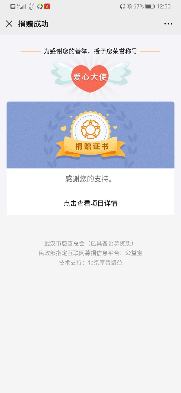 为武汉捐献上了一份关爱