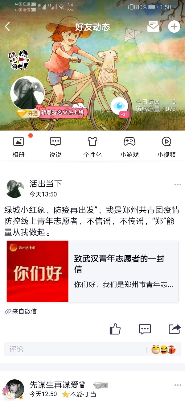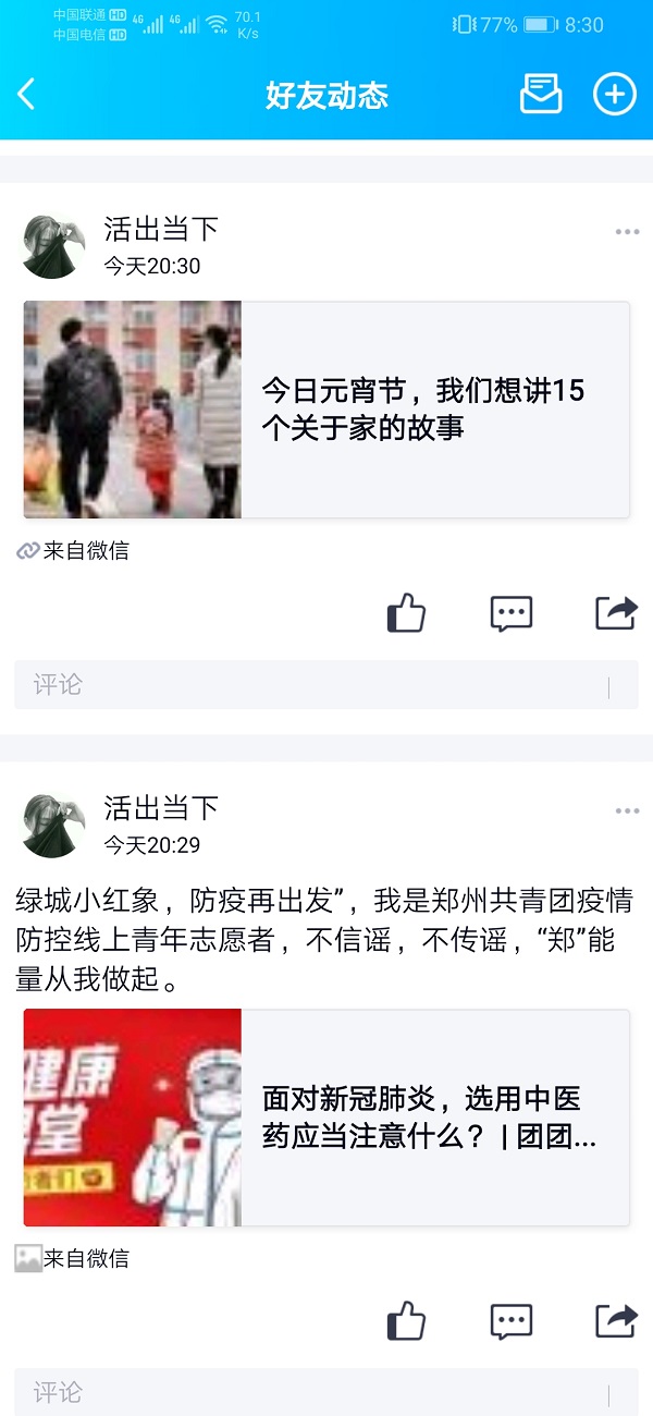 从一月二十七日报名参加线上志愿者活动开始至今,她每天都会发布一到两条有关动态,来进行宣传工作,现在累计已经发布二十一条动态,作为志愿者,对此工作,不敢有丝毫懈怠,适合保持作为志愿者的初心。不忘初心,砥砺前行。