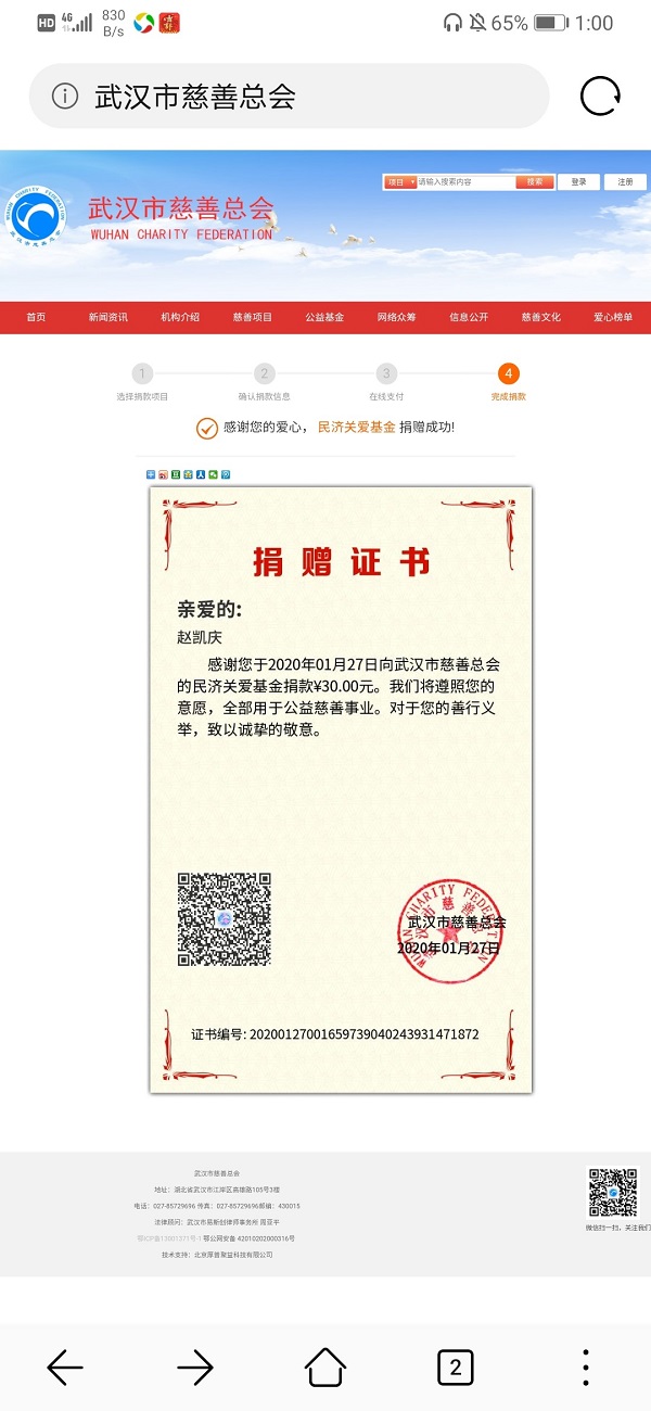河南省濮阳市1月27日当天,19级金融一班赵凯庆在抖音上看到了一个可以捐赠物资的官网平台,于是没再犹豫,在确定了可行后捐款了30元,虽然钱不多,但这是他的心意,他也愿尽自己所能帮助到所有的医护人员和患者。中国加油!武汉加油!面对当前的疫情,他深知这是一场没有硝烟的战争,这是不允许失败的战争,疫情的变化牵动着每个人,为了能够增加大家抗击疫情的信心,为了感谢那些勇敢的“逆行者”,他特地整理了新型肺炎疫情心得体会范文,在抗击新型冠状病毒感染肺炎上所有人要万众一心、众志成城,一定能够打赢疫情防控阻击战。