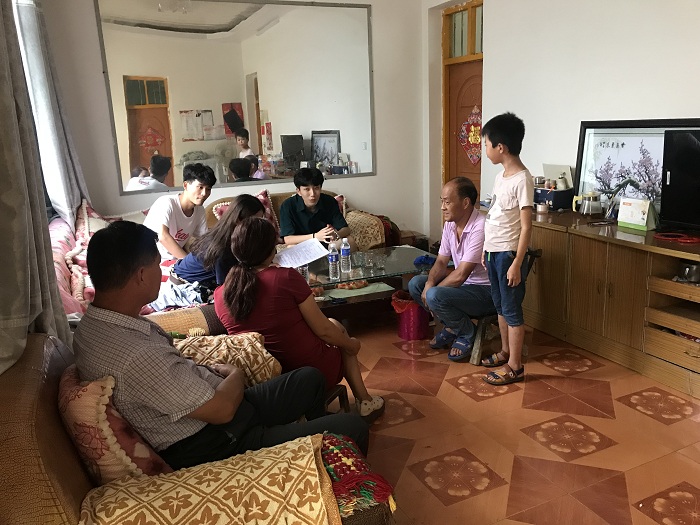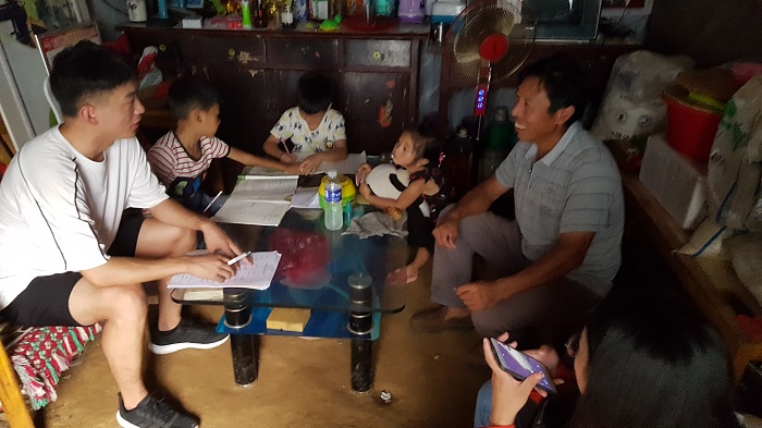 首先,志愿者服务队来到刘娟、张宝国家,通过调查得知,家中成年人为小学学历,家中9口人,五个孩子三个上小学,两个还没上学,家庭人均年收入2000-3000,由村民选举成为贫困户,并参加低保,夫妻二人进城务工,家中孩子由老人看护,希望能获得精准扶贫关于生产技术和就业方面的帮助。在访问调研后,志愿者们耐心的为孩子辅导功课,希望能尽微薄之力为孩子解决一些学业上的难题。刘娟和张宝见此,不断表示对志愿者服务队的感谢,并十分热情地接待。