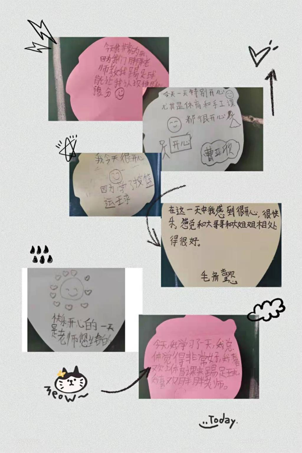 18:10下课啦!孩子们纷纷走到黑板边把自己的便利贴粘了上去,形成了一个“6”字,生动形象地展示着支教活动第一天小老师与同学们之间的有趣互动。