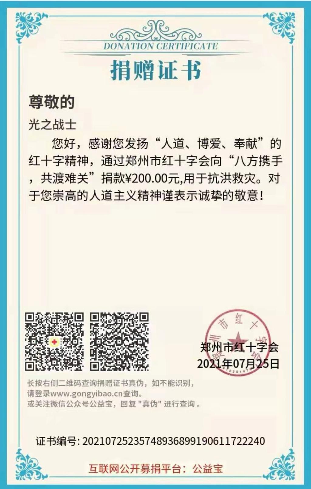 在郑州“7.20”特大洪水中,她积极参加管城区南关街志愿活动,为抗灾救援贡献自己的一份力量。在管城区南关街共青团委老师的指导下,她跟随志愿者团队帮助社区群众整理街道垃圾并宣传灾后传染病、疫情防控知识;前往银基、大观国贸商城,搬卸送往郑州的各地救援物资。在这次志愿活动中,她竭尽全力,积极参与志愿服务活动之中。她也表示:青年大学生肩上有自己需要扛的责任,请祖国放心,强国有我,在今后的学习生活中,竭尽所能贡献自己的青春,将一腔热血投入到社会服务中,不负人民,不负社会,不负国家!