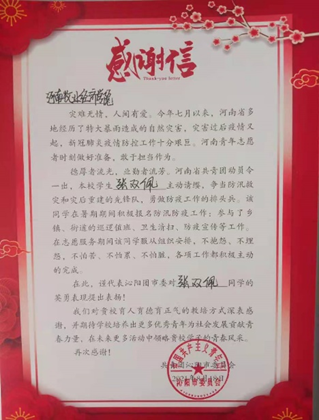 钱禹成同学的的家乡虽在河北唐山,却也在时刻关注着河南的洪灾和疫情。他积极参与志愿防疫工作,帮助社区登记来往车辆,为来往人员测量体温。 这次志愿服务让钱禹成同学深切的感受到了白衣战士的不易,在炎炎烈日之下仍要坚守岗位,只为疫情早日消散。志愿服务能让他体会到一种说不出来的快乐与自豪,为此他也表示:“开学之后,如有需要,我还会积极参与到各种志愿活动中,磨炼自己的意志,够提高思想见识,也期待着开学后与大家相识,成为好朋友。”