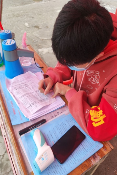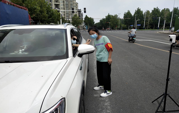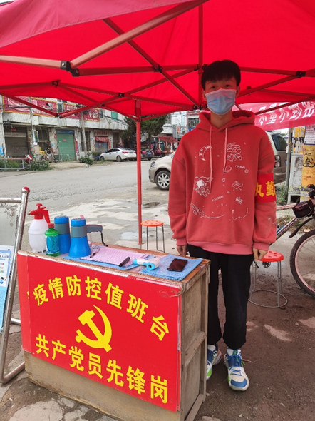 在经历了特大暴雨灾害之后又迎来了新的挑战,出现了新冠病毒的变异体。为第一时间响应号召朱炳森同学主动加入志愿服务,他每天的工作内容就是在小区出口处卡点,检测来往人员的体温,并做好相关的记录,对进出的车辆进行严格排查,对来往人员进行酒精消毒。