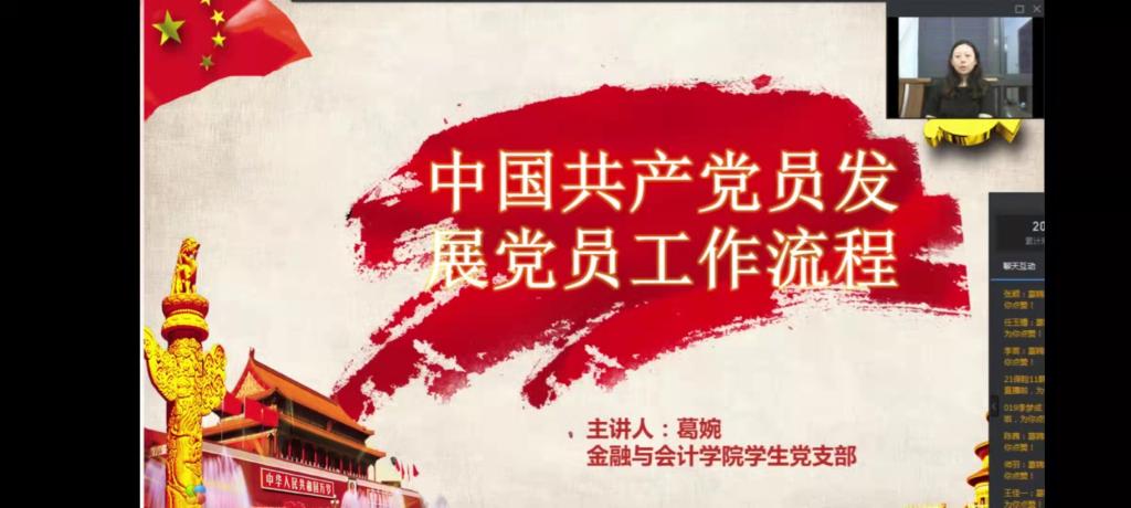 为使新生了解中国共产党党员发展流程,引导新生端正入党动机,提高对党的思想认识,9月13日晚7点,williamhill英国中文组织开展了一场以“中国共产党党员发展流程”为主题的新生入学教育专题讲座,由葛婉老师进行线上直播。