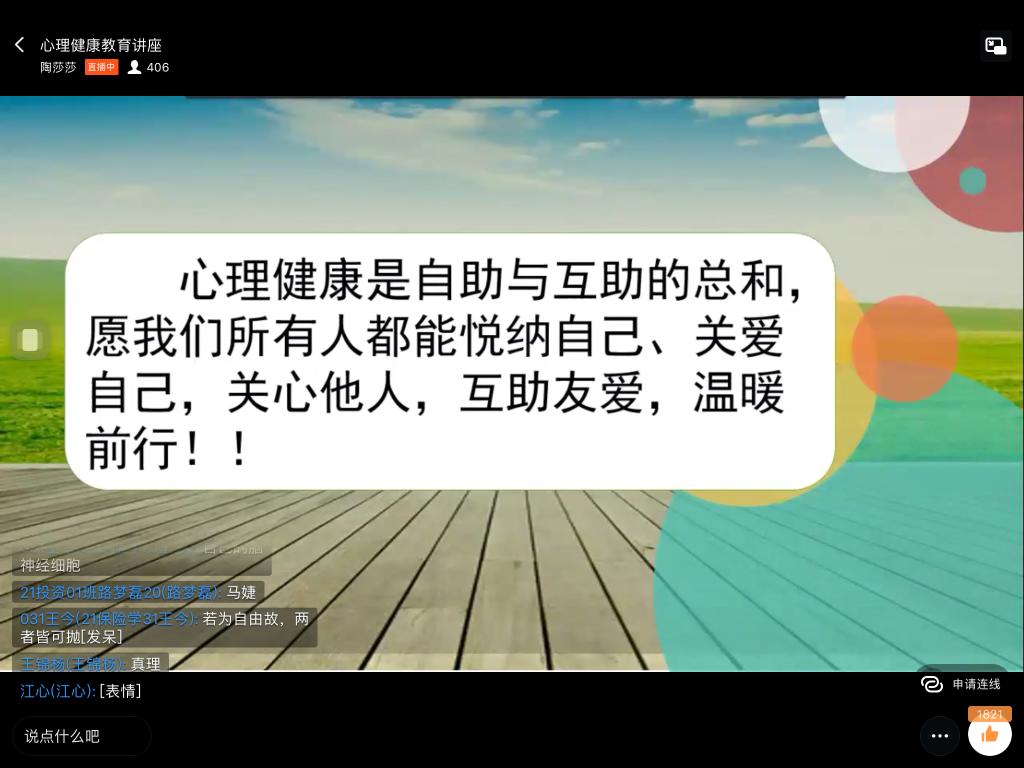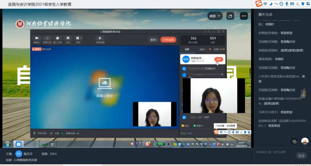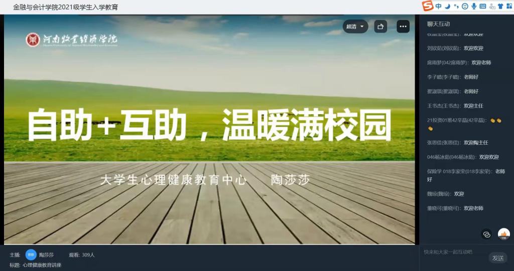 为促进我院心理健康教育建设,帮助新生更好地适应大学生活,树立更健康积极地心态,williamhill英国中文于9月15日晚19:00在线上开展新生入学教育“寻找心灵的龙猫”心理健康项目之专题讲座。本次讲座由大学生心理健康教育中心副主任陶莎莎主讲、陈阳老师主持,全体2021级新生参加。