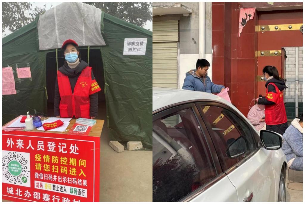 当下,仍然是疫情防控的关键时期,不容懈怠,面对较为严重的疫情形势,焦盈盈同学所居住的小区出现确诊病例被封控后,身为一名预备党员她时刻牢记为人民服务的宗旨,踊跃报名高新区党群服务志愿者,帮助社区组织核酸检测、登记人员信息、在楼下站岗防止居民乱出行、为有需求的民众搬运物资,身在郑州,守好家园健康门,为维护广大人民切身利益作出贡献,她在用行动践行共产党员的初心和使命。她相信在大家共同努力下,一定会扛过新冠,欢庆新年!
