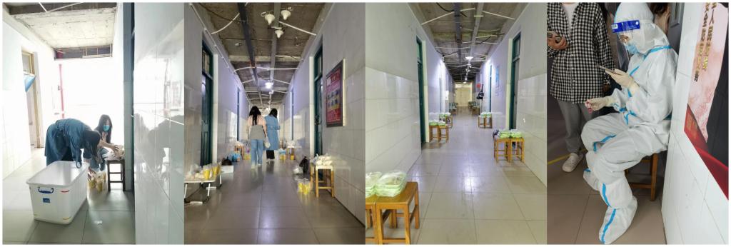 中午12点,9号楼开始了核酸检测。刚送完餐的老师们顾不上喝口水休息一下,就开始穿上闷热的隔离服,核酸检测扫码、维持2米间距、挨个敲门下楼核酸检测。