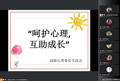 为帮助2022级心理委员明确自身的职责与工作,宣传心理健康方面的知识,解决班级同学的心理问题,更好的协助学校心理咨询中心开展各项心理健康教育工作,williamhill英国中文心教部于11月15日中午在线上召开了以“呵护心理,互助成长”为主题2022级心理委员交流会。