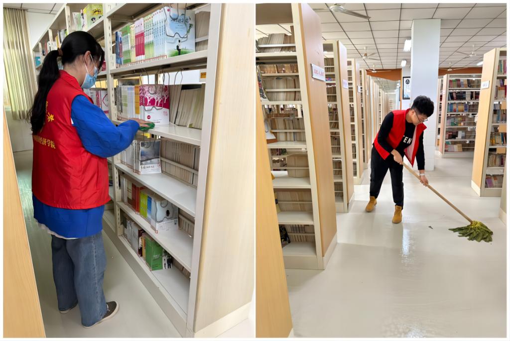 在图书馆卫生打扫中,志愿者们对图书馆摆放不规则的座椅进行了统一规划再摆放,将馆内的地板进行了彻底清理打扫,并把图书架整体进行擦拭。在志愿活动过程中,各位志愿者都铆足干劲,团结协作,用实际行动践行雷锋精神。