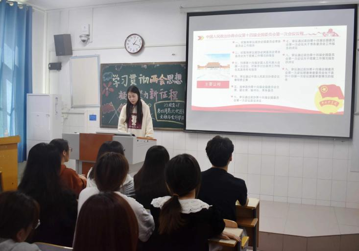 伴随着嘹亮的团歌声,各团支部组织的团课相继开展。在本次团课中,各团支部积极引导同学们关注“两会”议程、学习“两会”精神,让同学们围绕“学习贯彻两会精神,凝心聚力新征程”主题表达自己的看法和感想。本次团课中也让同学们感悟两会精神,积极追随中国共产党的脚步,紧紧向中国特色社会主义思想核心靠近,为实现中国共产党的伟大胜利而共同努力,展现出新中国的时代风貌。