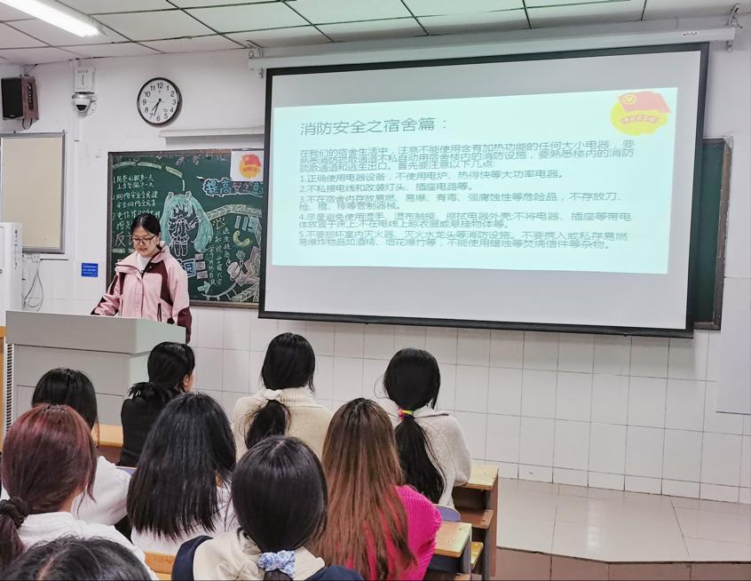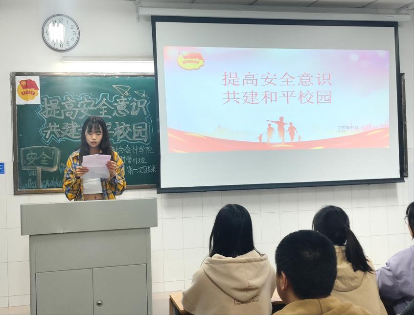 伴随着嘹亮的团歌声,各团支部的团课活动相继展开。首先,各团支书通过列举相关安全事件和播放视频向同学们展示了校园安全的重要性,并借此警醒同学们要提高安全意识,重视校园安全。接着,团支书邀请同学们分享自己在校园中所关注到的各种安全问题,并就相关安全问题提出应该如何防范。最后,各团支书通过答题的方式帮助同学们学习消防自救知识、提高识别和防范网络诈骗能力,增强自我保护意识,为共同建造校园安全打造坚实基础。