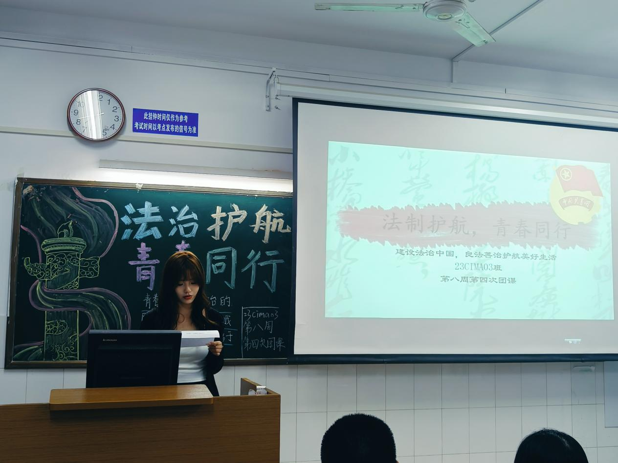 伴随着嘹亮的团歌声,团课活动正式开始。首先,各班团支书采用了PPT、视频等宣传材料相结合的方式,向同学们详细的介绍了法治的重要性,切实增强了同学们学习法律的意识。随后,学生代表根据自己查阅的资料,向同学们介绍了一些违法、犯法的典型案例,以便同学们充分提高遵守法律的意识。最后,各班团支书进行总结发言,号召所有青年学生认真学习贯彻习近平法治思想,强化自觉守法意识,增强自我保护能力。