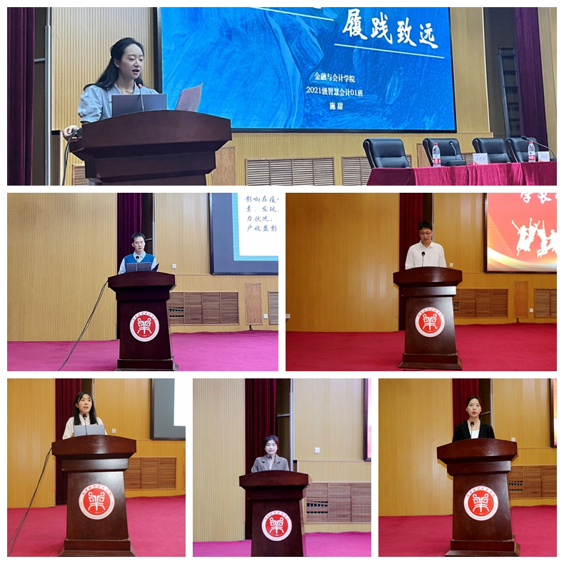 大会还邀请了我院在学习、竞赛等方面颇有经验的优秀学生代表进行经验分享交流。被中南财经政法大学研究生录取的蒋家洋从学习目标的确立、学习习惯的养成、学习方法的创新以及综合能力的培养等方面给大家带来了满满的“干货”;上岸武汉科技大学研究生的滑博鑫从心态、时间管理、择校技巧等方面分享了一些实用的方法;获得挑战杯、学创杯等多个国家级、省级竞赛奖的施甜从增强求知欲、提升行动力、实现新价值等方面分享了在竞赛方面的切身体会;获得国家奖学金陈彦卓和获得国家励志奖学金的任香福分别从自我反省、把握当下、怀抱理想和明确目标、制定计划,实践路径等方面分享了如何在学习和成长的道路上坚定信念,履践致远。